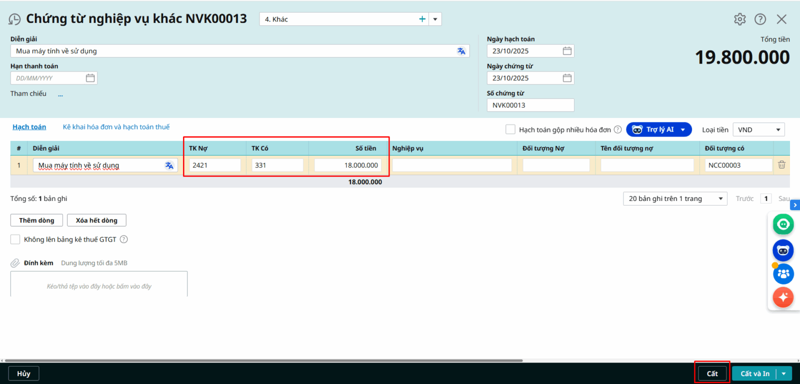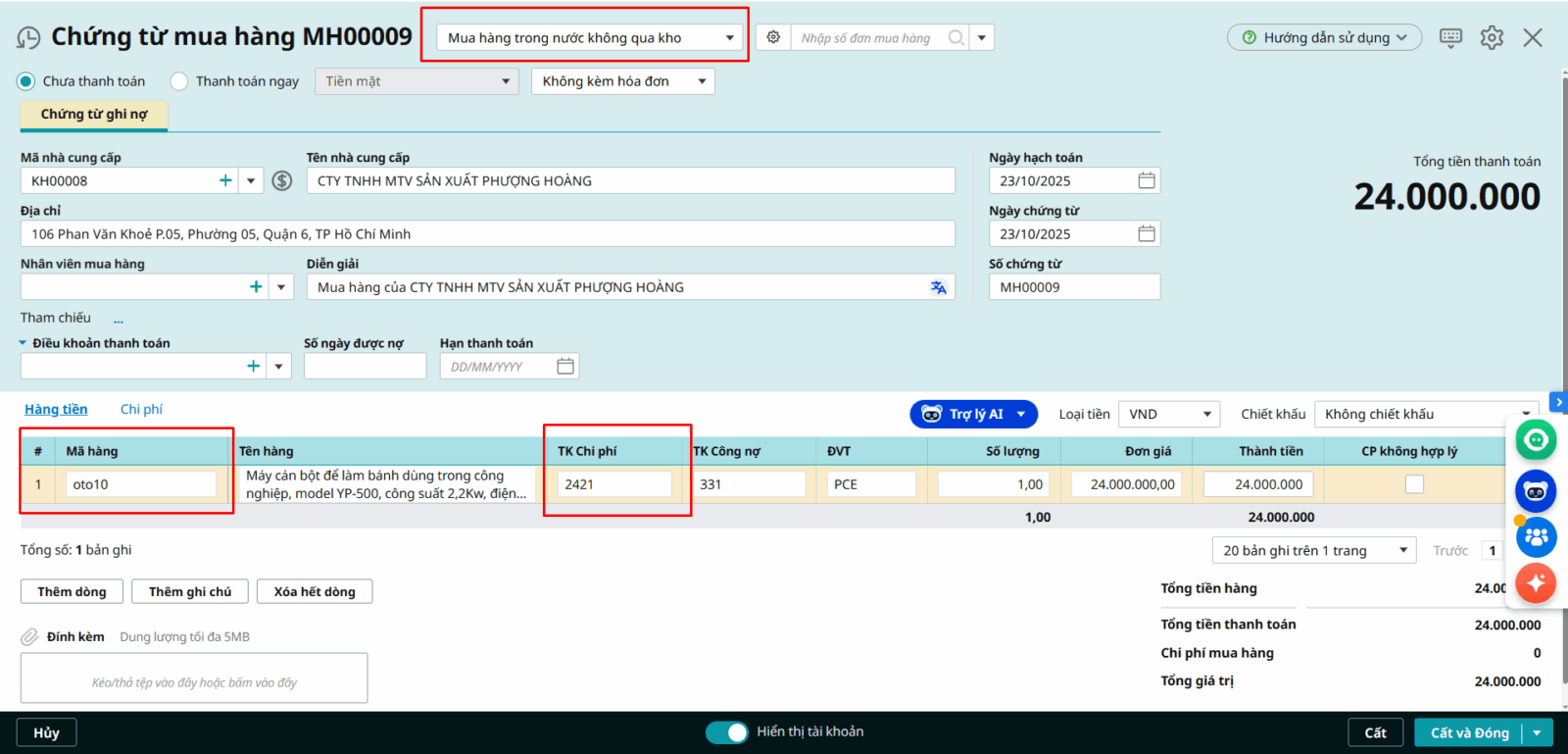 - Nếu Doanh nghiệp mua CCDC, TSCĐ cùng 1 hóa đơn: Anh/Chị thực hiện lập chứng từ (Ví dụ: Chứng từ mua hàng trong nước không qua kho) tách riêng từng dòng CCDC (Hạch toán TK242), TSCĐ (Hạch toán TK211) thành từng dòng riêng biệt: