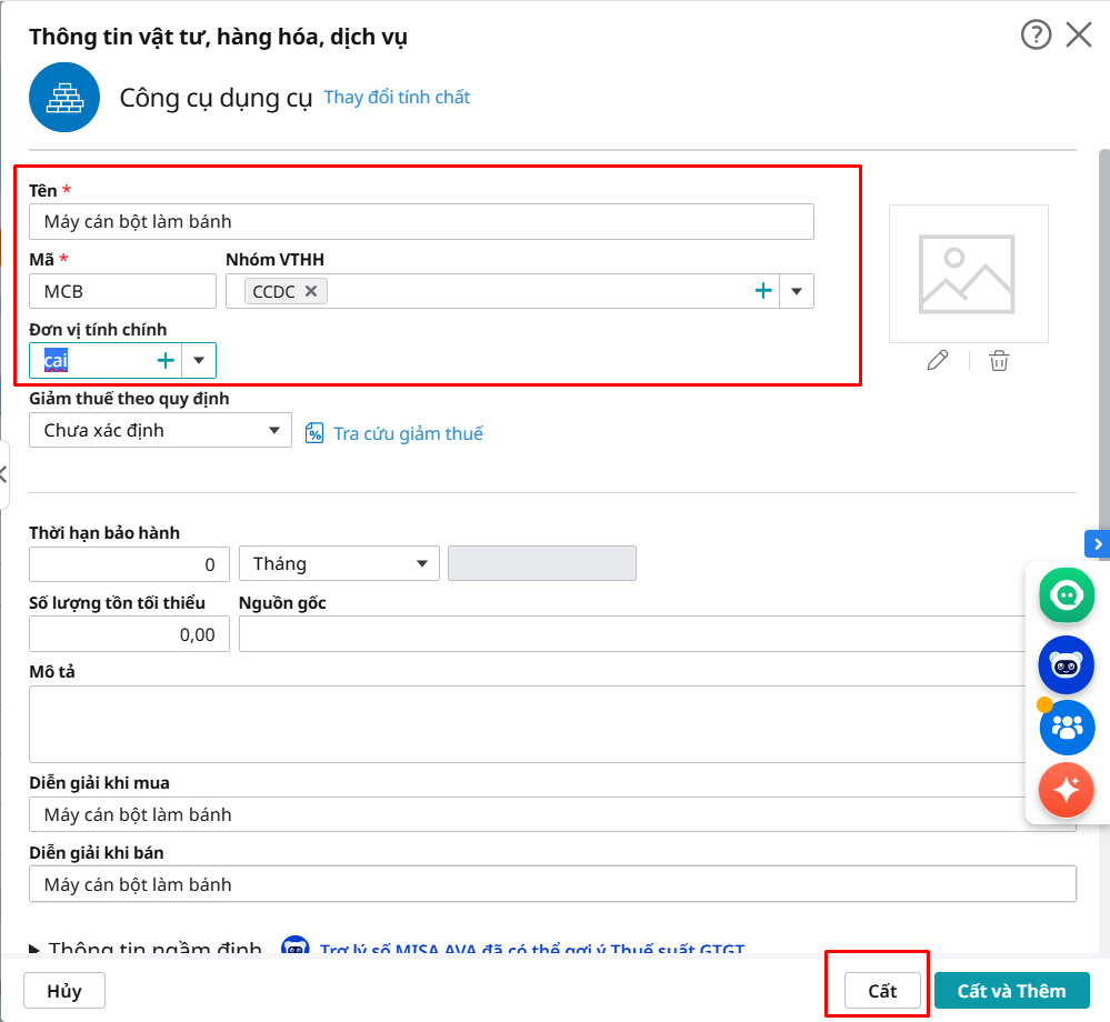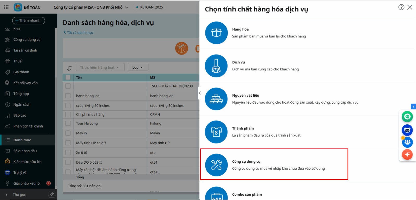 Trường hợp 2: Doanh nghiệp có nhu cầu quản lý CCDC như một mã VTHHVới các doanh nghiệp có nhu cầu quản lý CCDC như một mã VTHH, việc ghi tăng CCDC được thực hiện thông qua 2 bước sau: Bước 1: Vào Danh mục\ Vật tư hàng hóa\ nhấn Thêm