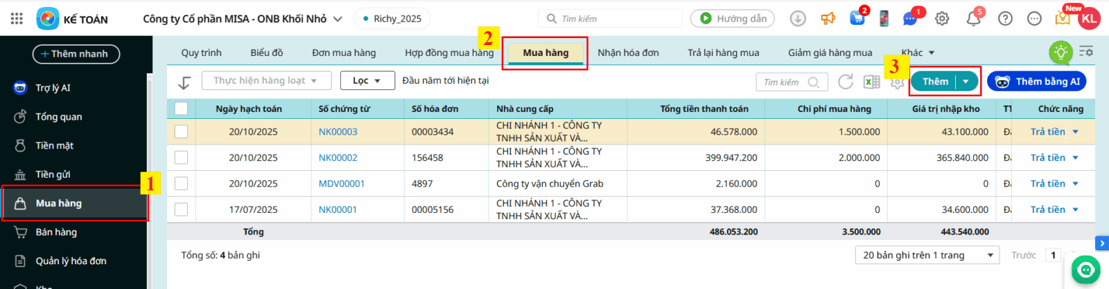Bước 2: Lập chứng từ mua hàng để hạch toán nghiệp vụ mua CCDC