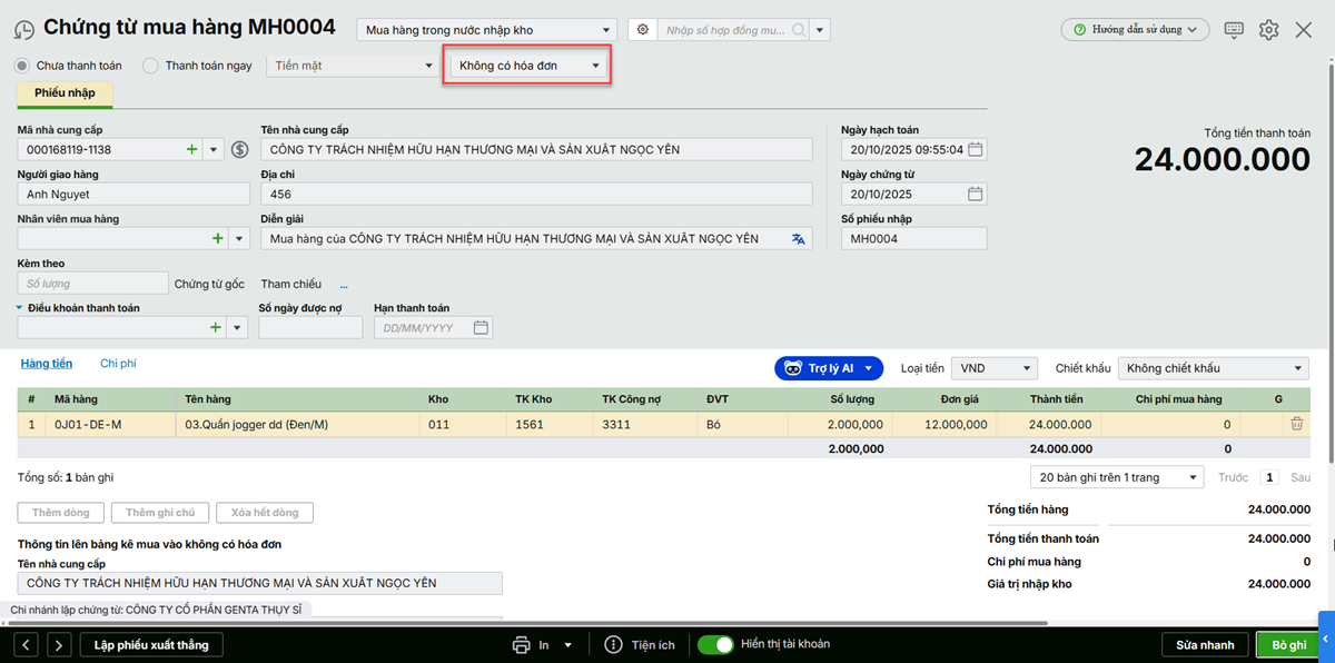 4.5. Đối với trường hợp mua hàng đã nhận được hóa đơn của nhà cung cấp, khi lập chứng từ mua hàng kế toán sẽ chọn giá trị là Nhận kèm hóa đơn. Đồng thời khai báo thông tin về hóa đơn mua hàng trên tab Hóa đơn.