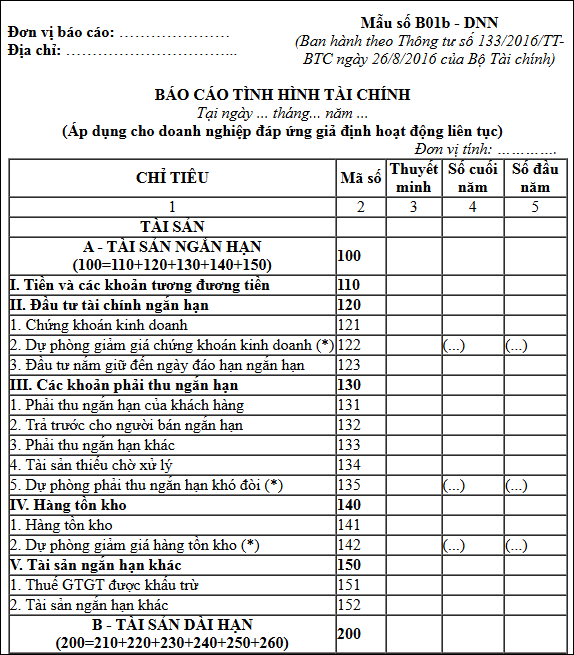 - Mẫu số B01b – DNN: Tài sản và Nợ phải trả được trình bày phân chia thành Ngắn hạn và Dài hạn.