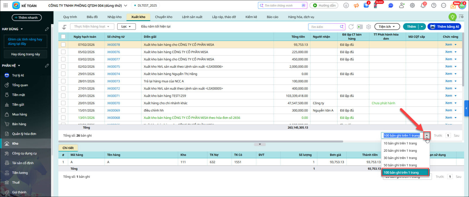 Lưu ý: Nếu muốn tăng số lượng chứng từ để có thể chọn cùng lúc, Anh chị có thể nhấn vào ∇ ở mục số bản ghi trên 1 trang và tăng số bản ghi lên tối đa 100 bản ghi trên 1 trang