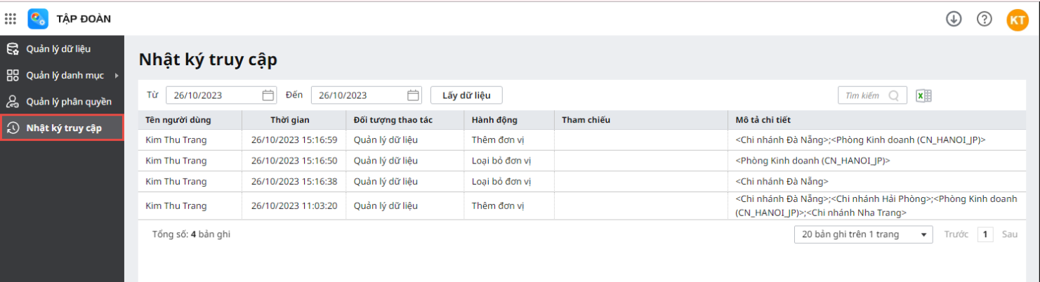 - Thời gian: hiển thị thời gian phát sinh thao tác làm thay đổi dữ liệu, được sắp xếp theo thứ tự giảm dần về thời gian (những nhật ký truy cập gần nhất được sắp lên đầu tiên).