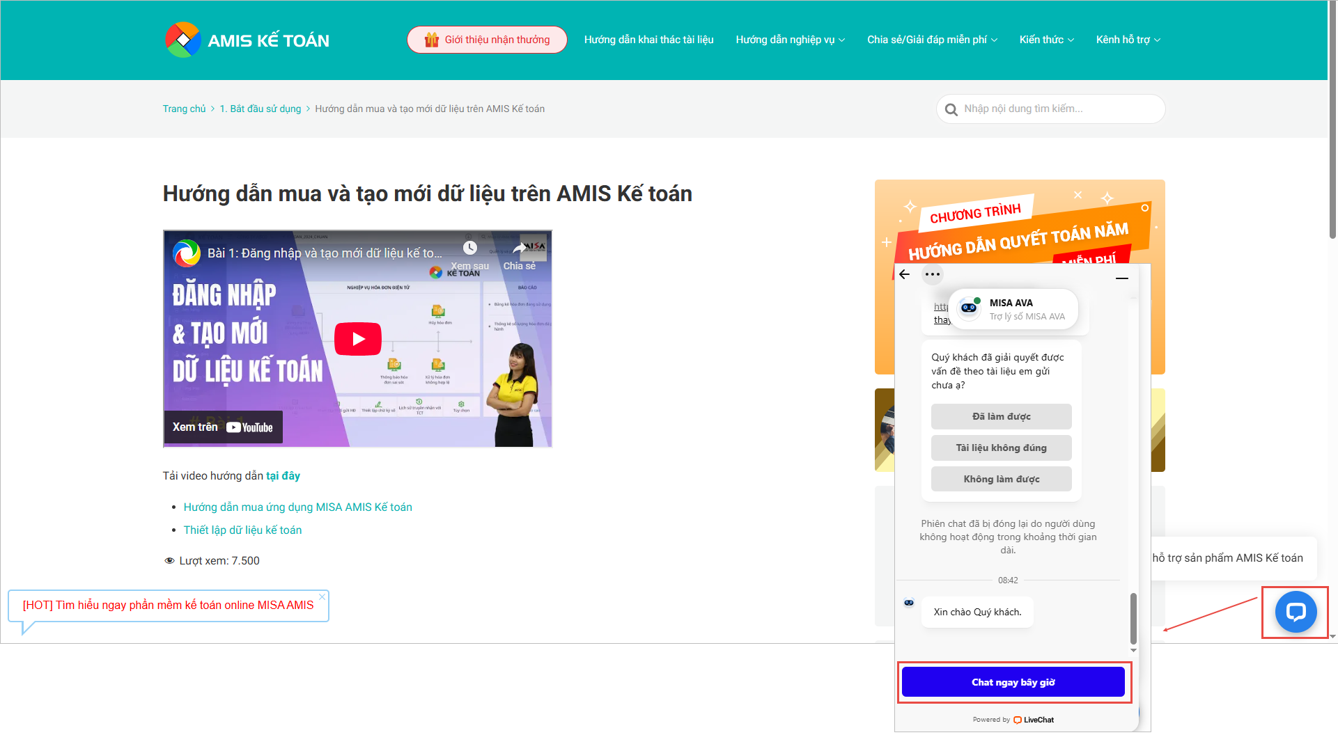 Quý khách hàng vui lòng liên hệ trực tiếp với kênh LiveChat của MISA trên trang hướng dẫn sử dụng Tại đây để được hỗ trợ: