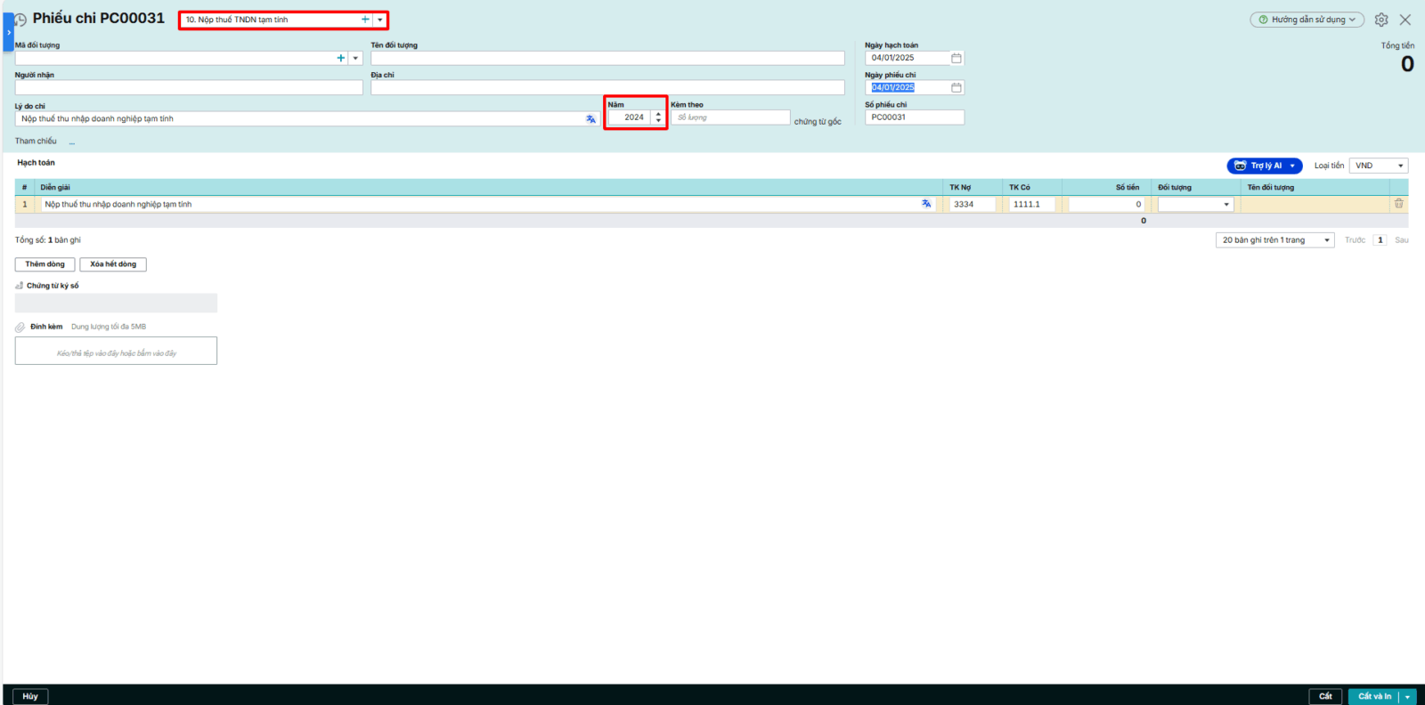 - Chọn Lý do chi: Thuế TNDN tạm tính.