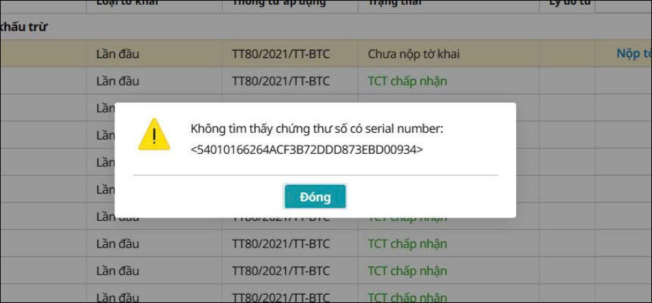 4.5 Nộp tờ khai thuế qua mTax báo lỗi <Không tìm thấy chứng thư số có số serial number...>