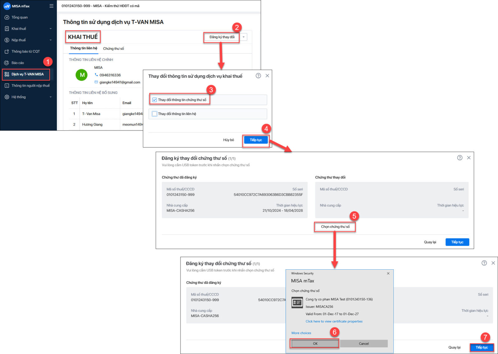 Nguyên nhân: Do đơn vị mới thay đổi hoặc gia hạn chứng thư số mà chưa đăng ký lại chứng thư số mới trên mTax Cách xử lý: Thực hiện đăng ký lại chứng thư số mới trên mTax theo các bước sau Lưu ý: Cần cắm USB token chứa chứng thư số mới của đơn vị vào máy tính. Bước 1: Truy cập vào đường dẫn https://mtaxapp.misa.vn/ và đăng nhập vào phần mềm MISA mTax. Bước 2: Vào mục Dịch vụ T- VAN MISA, trên phần thông tin Khai thuế nhấn Đăng ký thay đổi. Bước 3: Chọn Thay đổi thông tin chứng thư số \ Nhấn Tiếp tục Bước 4: Nhấn Chọn chứng thư số. Bước 5: Chọn chứng thư số thay đổi, nhấn Tiếp tục.