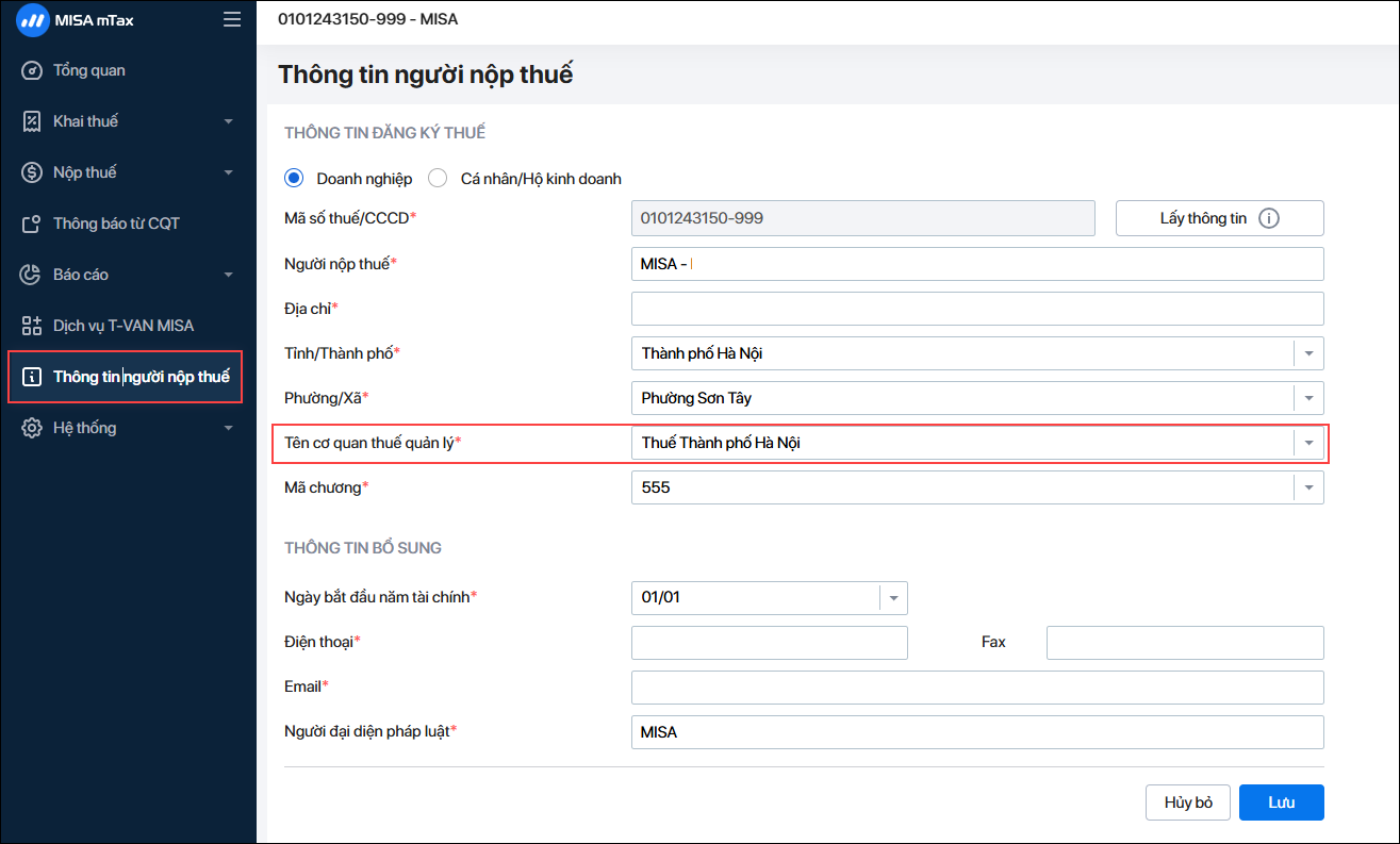 4.1 Thiết lập cơ quan thuế quản lý trên MISA mTax