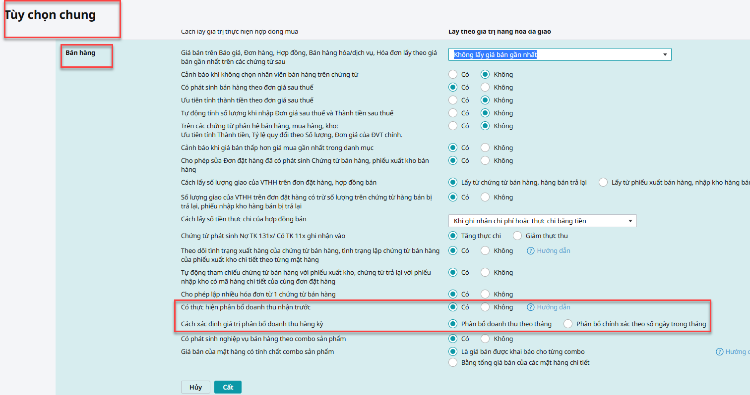- Tại mục Bán hàng, tích chọn Có thực hiện phân bổ doanh thu nhận trước và chọn Cách xác định giá trị phân bổ doanh thu hàng kỳ ( thiPhân bổ doanh thu theo tháng hay Phân bổ chính xác theo số ngày trong tháng)