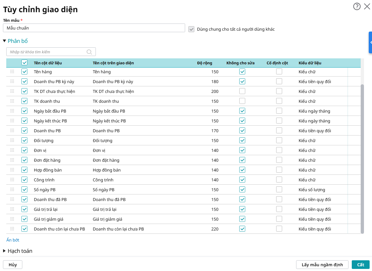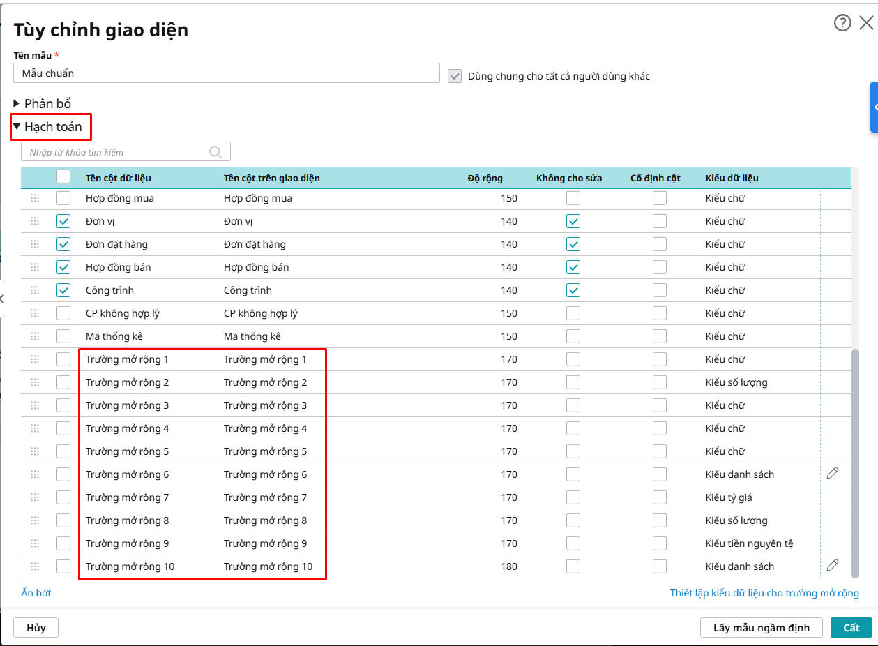 Lưu ý: Trên chứng từ phân bổ doanh thu nhận trước, Anh/Chị có thể thêm trường mở rộng trên tab Hạch toán, trên Tab phân bổ không có trường mở rộng để tùy chỉnh.