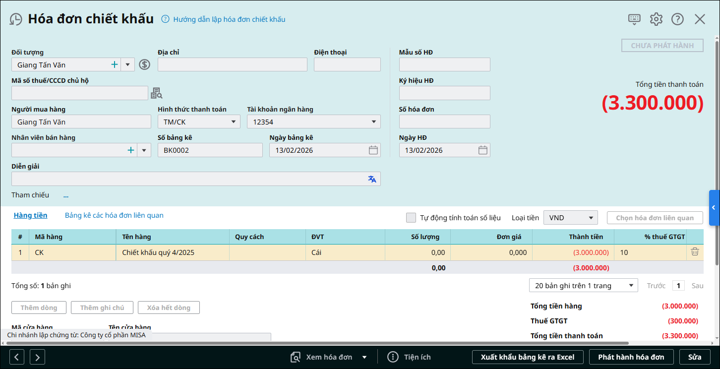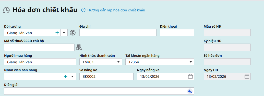 Bước 2: Khai báo các thông tin chung của hóa đơn chiết khấu.
