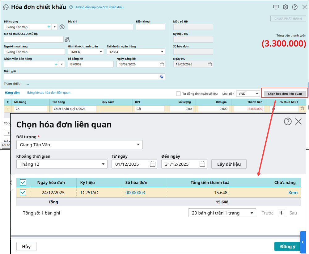 - Nhấn Chọn hóa đơn liên quan