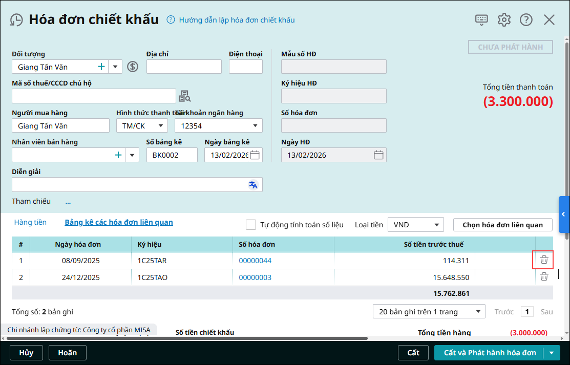 - Trường hợp muốn loại bỏ hóa đơn liên quan đã được chọn, nhấn vào biểu tượng thùng rác: