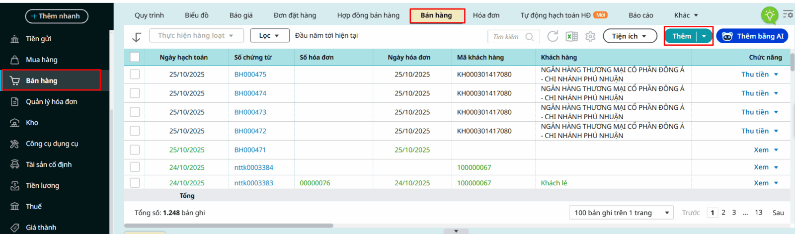 Bước 1: Vào phân hệ Bán hàng, tab Bán hàng, chọn Thêm.