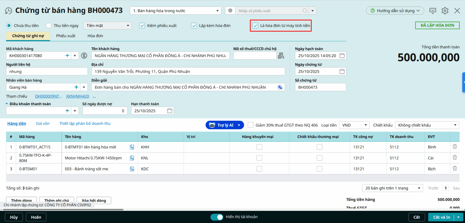 Lưu ý: Lập chứng từ bán hàng từ hóa đơn điện tử khởi tạo từ máy tính tiền: tại đây.