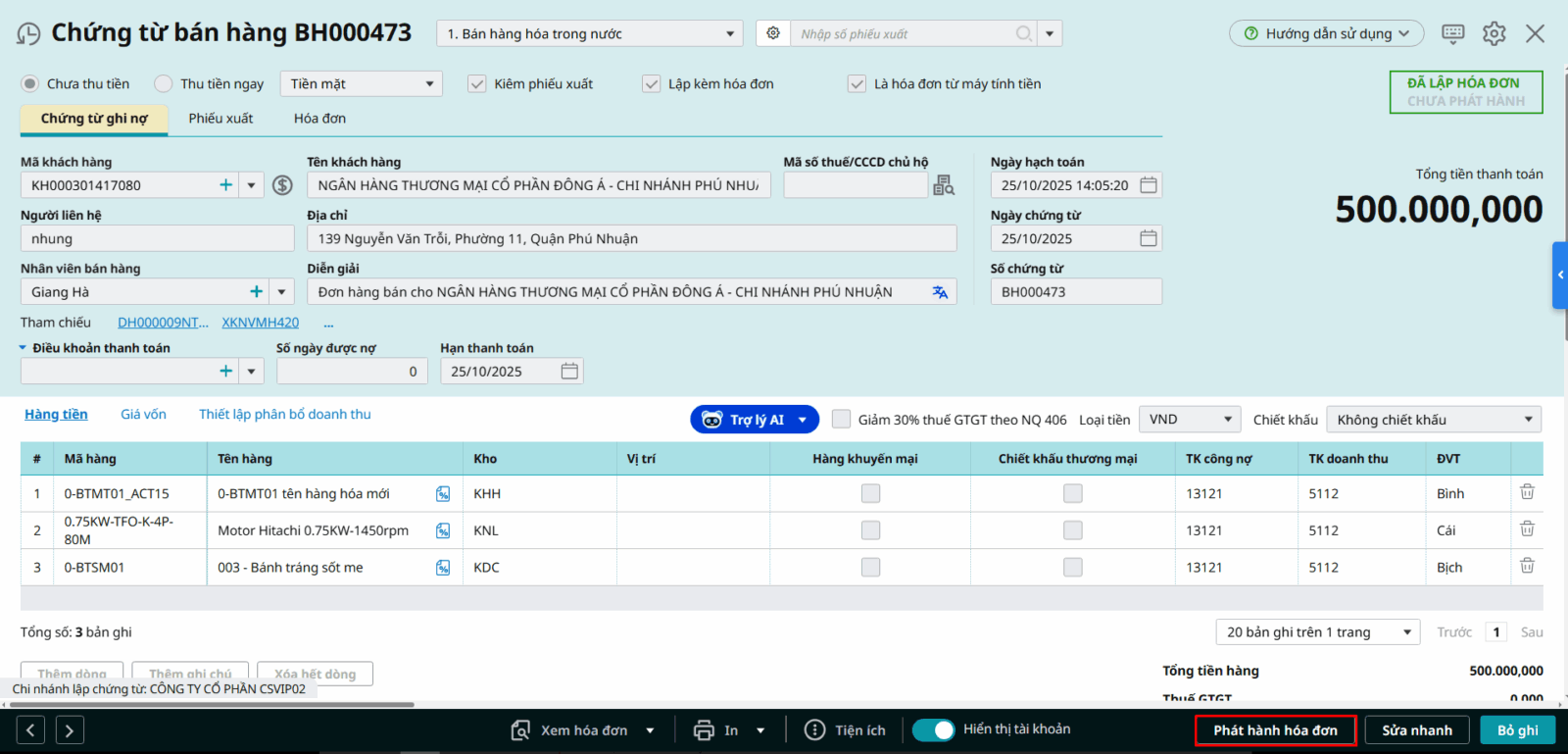 Bước 1: Trên giao diện chứng từ bán hàng/ Nhấn Phát hành hóa đơn