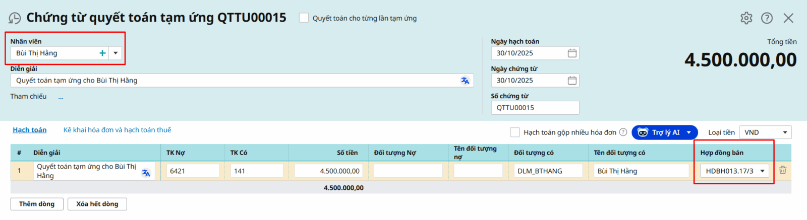 Bước 2: Khai báo các thông tin về chứng từ quyết toán tạm ứng.
