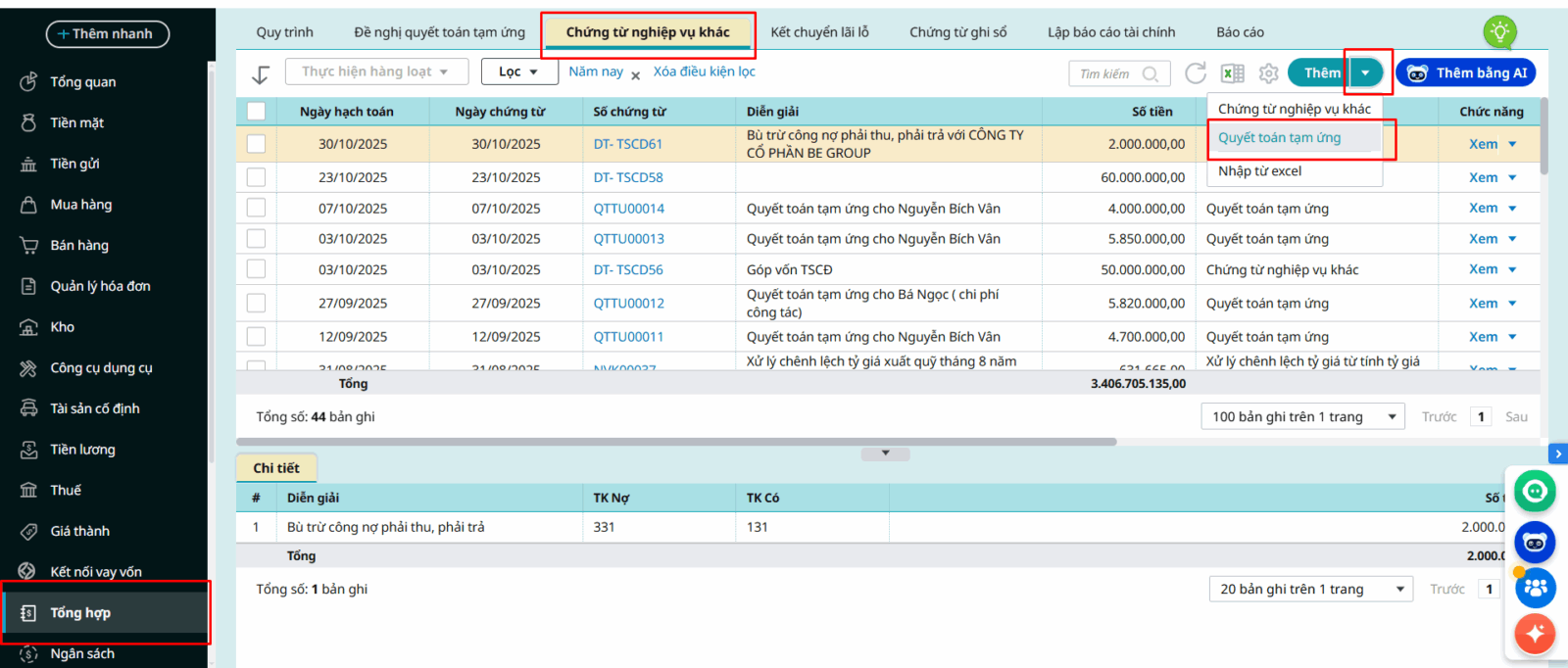 2.2. Quyết toán tạm ứng cho nhân viênBước 1: Vào phân hệ Tổng hợp, tab Chứng từ nghiệp vụ khác, chọn Thêm\ Quyết toán tạm ứng: