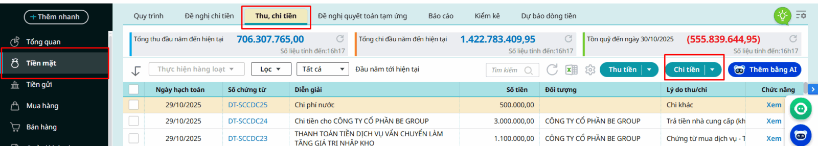 2.1. Chi tạm ứng cho nhân viênViệc chi tạm ứng cho lái xe, phụ xe có thể được thực hiện trên phân hệ Tiền mặt hoặc Tiền gửi. Bước 1: Thêm mới chứng từ Chi tiền mặt hoặc Chi tiền gửi ( Ví dụ: Vào phân hệ Tiền mặt, tab Thu, chi tiền, chọn Chi tiền)