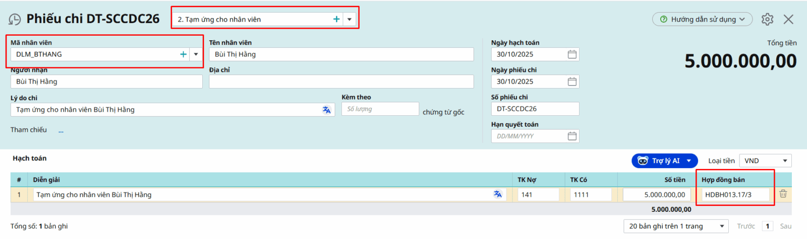 Bước 2: Chọn loại chứng từ chi là Tạm ứng cho nhân viên. Bước 3: Khai báo các thông tin trên phiếu chi: