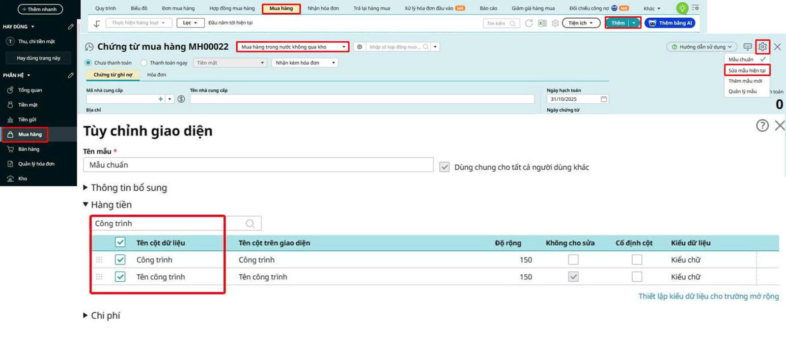 Lưu ý: Trên Chứng từ mua hàng cần chọn Công trình được xuất NVL tương ứng. Nếu không tìm thấy cột Công trình để chọn thì thực hiện hiển thị cột theo hướng dẫn tại đây