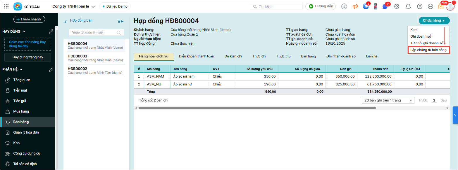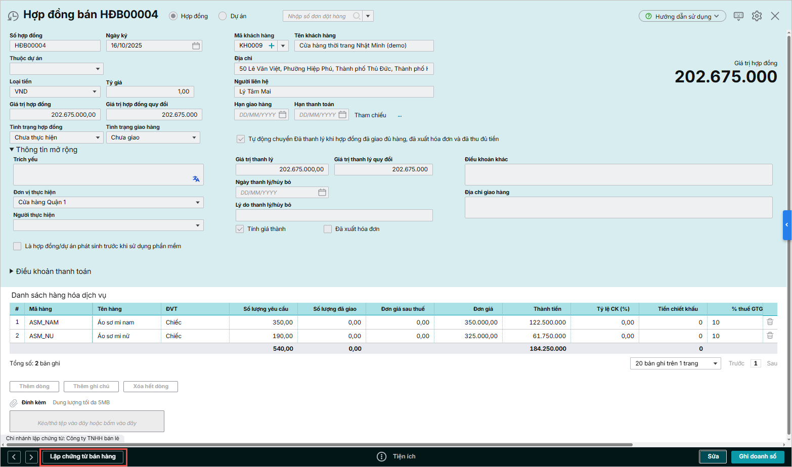 Cách 2: Lập chứng từ bán hàng trên chi tiết hợp đồng bán