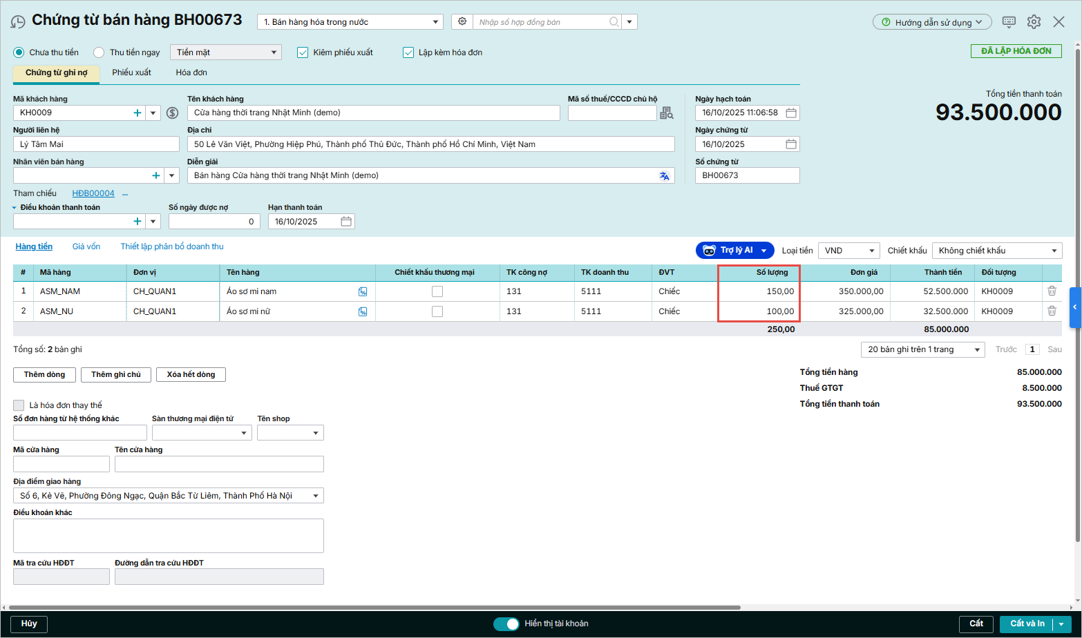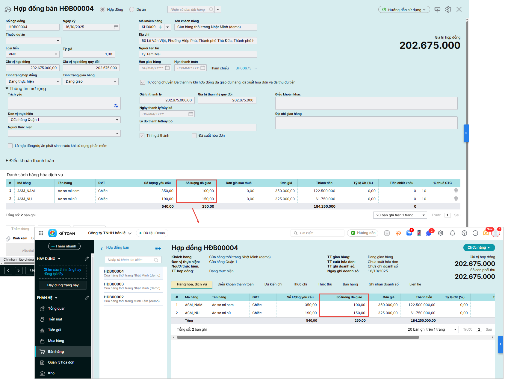 Sau khi sinh hóa đơn bán hàng từ hợp đồng bán, chương trình sẽ tự động cập nhật lại thông tin Số lượng đã giao của VTHH trên hợp đồng: