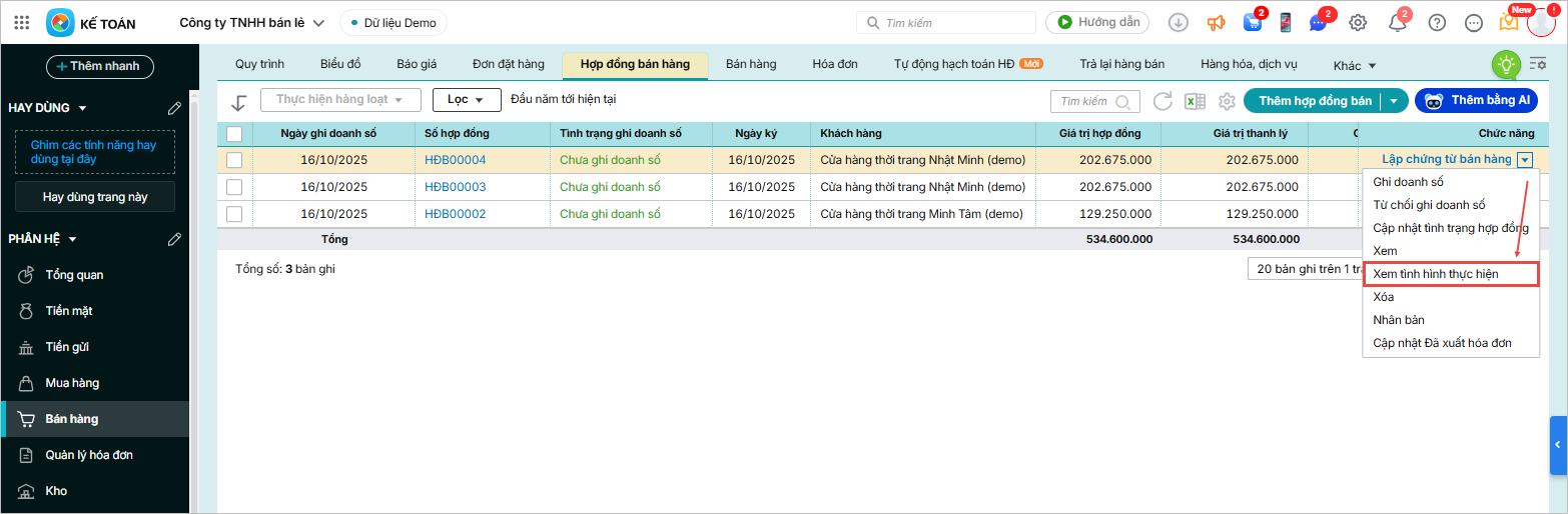 Cách 3: Lập chứng từ bán hàng trên giao diện Xem tình hình thực hiện hợp đồng bán