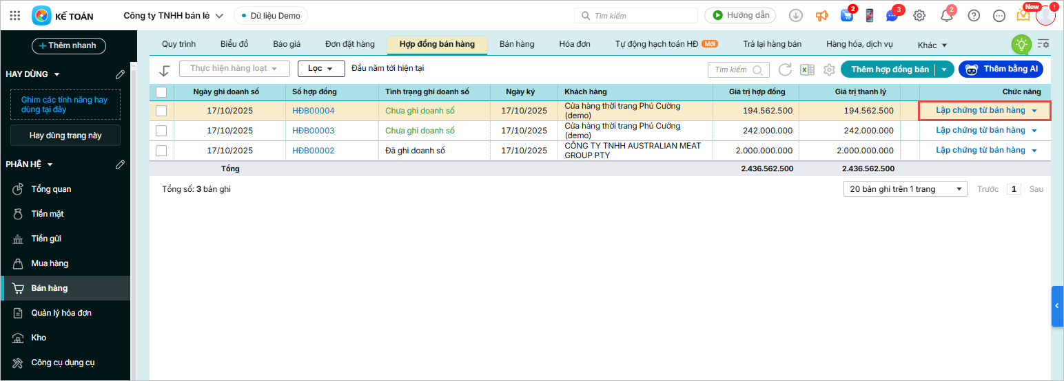 Cách 1: Lập chứng từ bán hàng từ danh sách hợp đồng bán