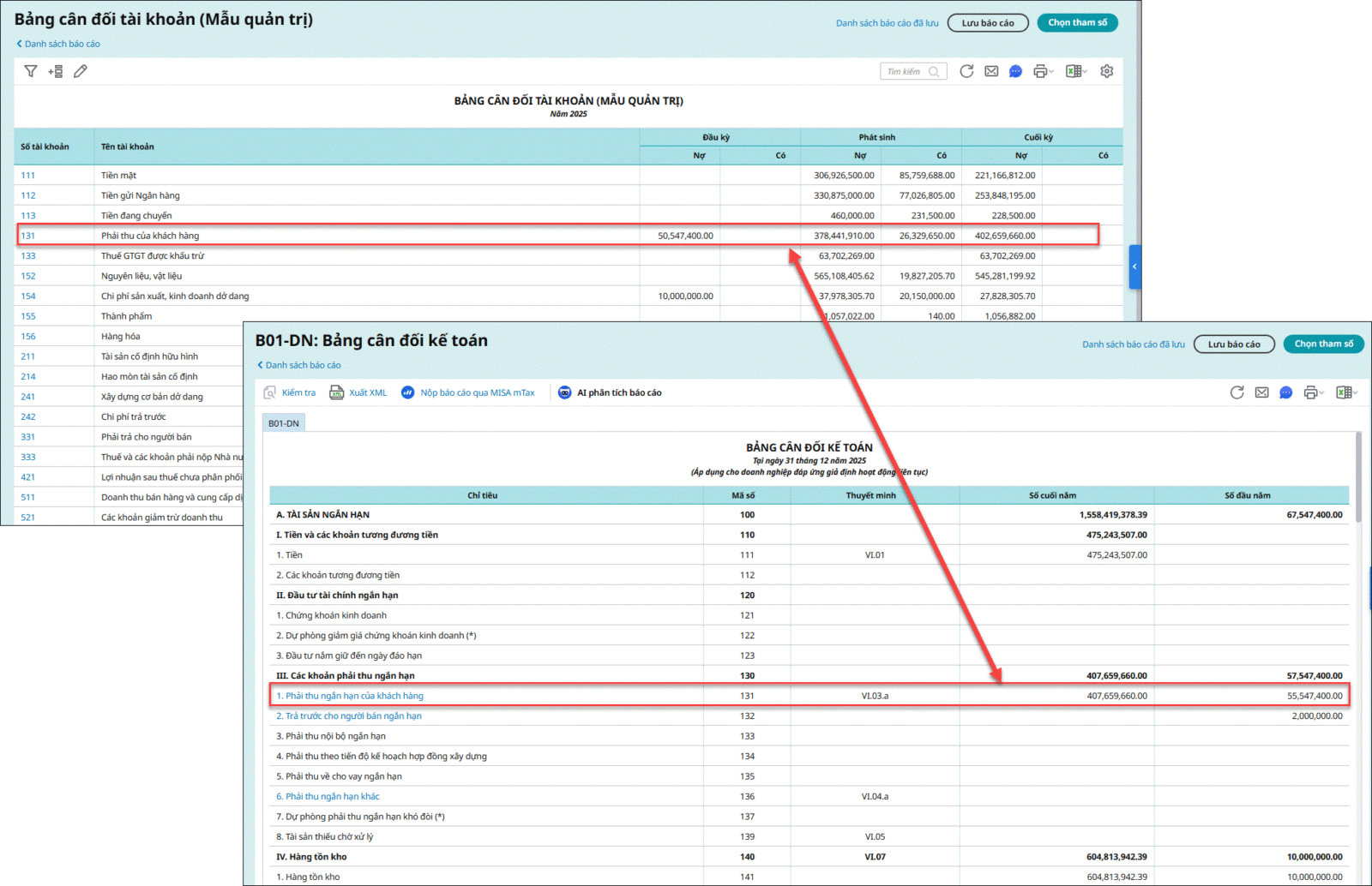 • Số dư nợ tài khoản 131 sẽ tương ứng chỉ tiêu Phải thu khách hàng