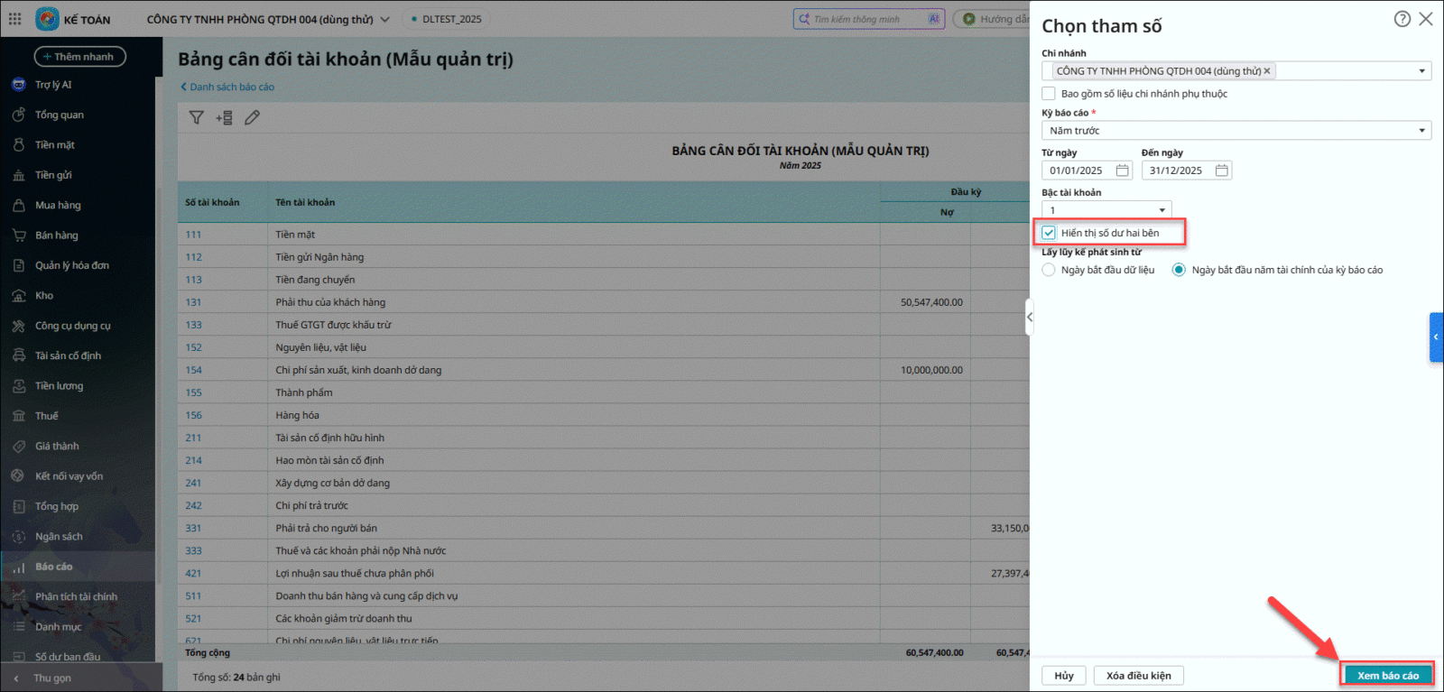 Bước 1: Vào Báo cáo \ Báo cáo tài chính \ Bảng cân đối tài khoản \ Chọn tham số xem báo cáo, tích chọn Hiển thị số dư 2 bên \ Xem báo cáo