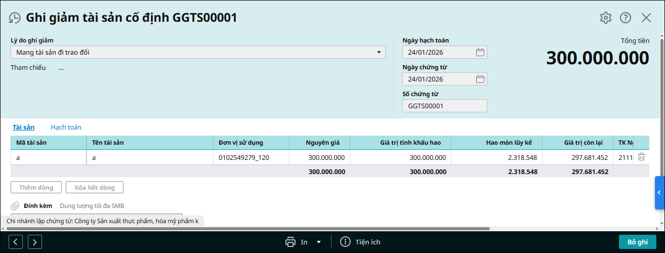 3.1 Ghi giảm TSCĐ mang đi trao đổi trên sổ TSCĐBước 1: Vào phân hệ Tài sản\tab Ghi giảm, chọn chức năng Thêm. Bước 2: Khai báo tài sản bị ghi giảm.