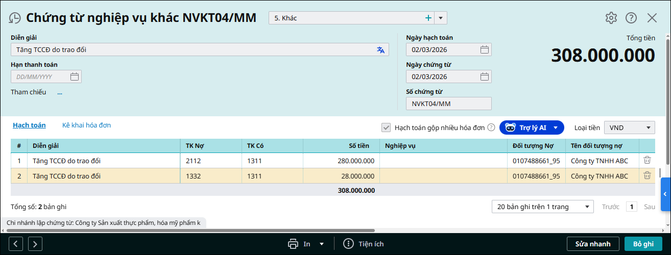Lưu ý: Bút toán ghi nhận doanh thu do mang TSCĐ đi trao đổi, nếu đơn vị không sử dụng hóa đơn điện tử MISA, anh/chị có thể thực hiện được trên phân hệ Tiền gửi hoặc Tổng hợp tùy thuộc vào phương thức thu tiền. 3.3 Hạch toán nghiệp vụ tăng TSCĐ nhận về do trao đổiTùy thuộc vào phương thức thanh toán mà nghiệp vụ này sẽ được thực hiện trên phân hệ Quỹ, Ngân hàng hoặc Tổng hợp. Ví dụ: trên phân hệ Tổng hợp. Bước 1: Vào phân hệ Tổng hợp, chọn Chứng từ nghiệp vụ khác (hoặc vào tab Chứng từ NVK, nhấn Thêm\Chứng từ nghiệp vụ khác). Bước 2: Khai báo chứng từ tăng TSCĐ nhận về do trao đổi.