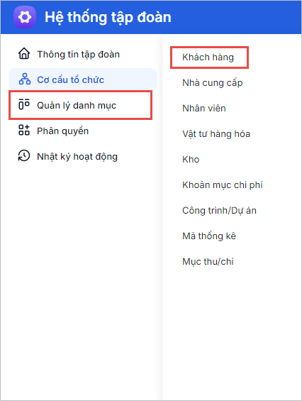 - Bước 1: Trên ứng dụng AMIS Hệ thống: Hệ thống tập đoàn, chọn Quản lý danh mục\Khách hàng: