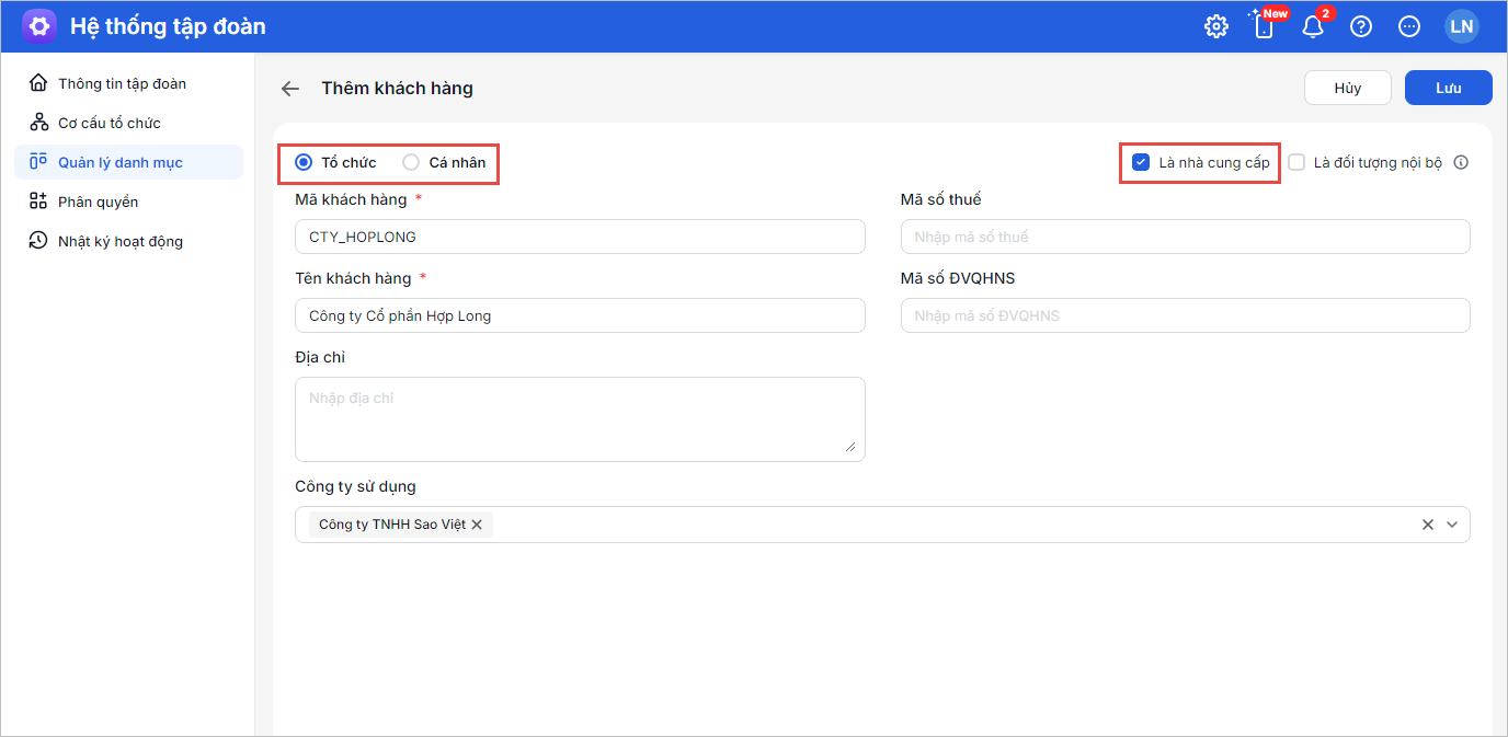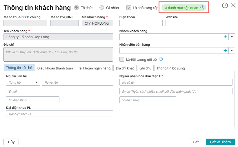 - Bước 6: Đồng thời khách hàng này sẽ được hệ thống tự động đánh dấu Là danh mục tập đoàn: