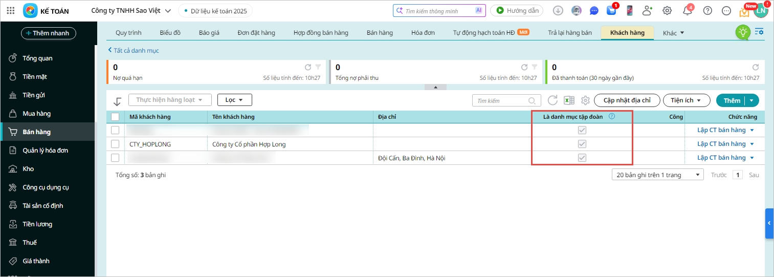 - Trên giao diện danh sách khách hàng: Hiển thị tích trên cột Là danh mục tập đoàn