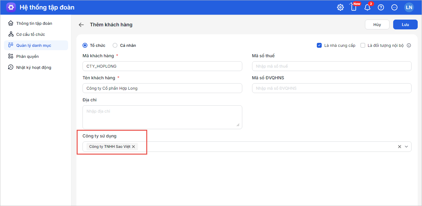 - Tại mục Đơn vị sử dụng: Lựa chọn các đơn vị (Công ty mẹ/Công ty con) được sử dụng danh mục này. Danh mục khách hàng sẽ được tự động đồng bộ về dữ liệu kế toán của các đơn vị sử dụng.