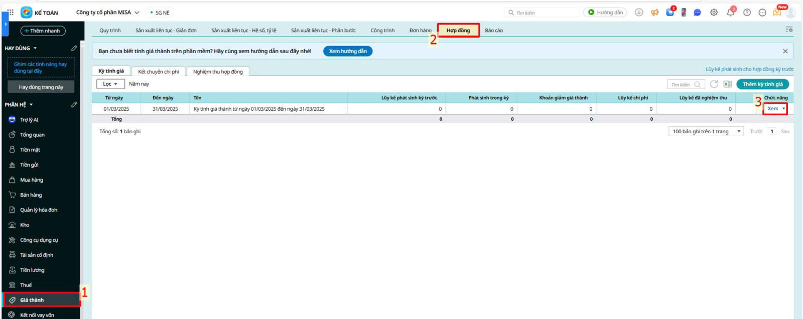 Bước 9: Sau khi tính giá thành xong Thông qua cột chức năng trên danh sách kỳ tính giá thành: