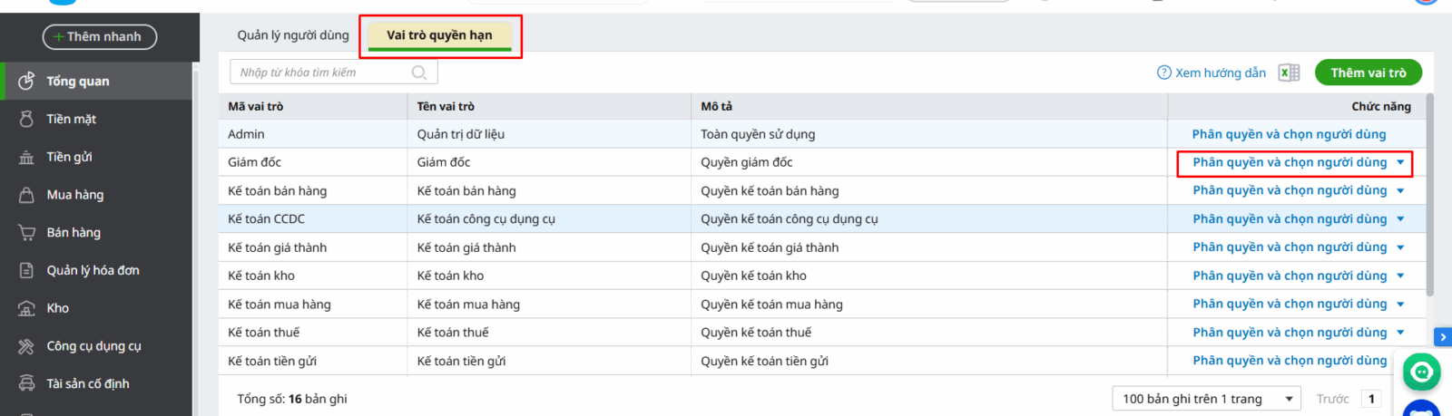 Bước 2: Chọn sang tab Vai trò quyền hạn, tại vai trò đã phân cho nhân viên, chọn Phân quyền và chọn người dùng ở cột Chức năng