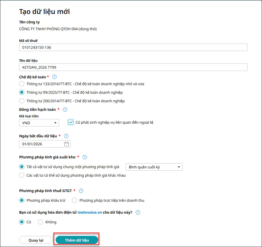 - Các thông tin còn lại chọn tương tự với dữ liệu cũ theo TT 133 (đồng tiền hạch toán, phương pháp tính giá xuất kho, phương pháp tính thuế GTGT, có sử dụng hóa đơn điện tử meInvoice.vn cho dữ liệu này hay không…)