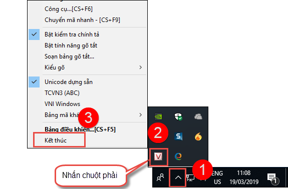 Bước 4: Khởi động lại máy tính và kiểm tra xem đã gõ được tiếng Việt trên phần mềm chưa? Nếu chưa thì chuyển sang thực hiện bước 2.4. 2.4. Tắt các phần mềm gõ tiếng Việt khác trên máy tínhNếu cài đặt nhiều phần mềm gõ tiếng Việt trên máy tính như: Gõ Tiếng Việt, Unikey, Vietkey… và để chế độ khởi động cùng hệ thống, thì dễ gây ra xung đột giữa các phần mềm này, dẫn đến không gõ được tiếng Việt trên phần mềm AMIS Kế toán. Chỉ nên sử dụng một phần mềm Unikey và tắt các phần mềm gõ tiếng Việt khác. Các bước thực hiện như sau: Bước 1: Nhấn chuột phải vào thanh công cụ bên dưới màn hình.
