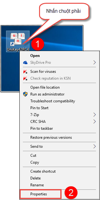 Bước 1: Trên màn hình Desktop, nhấn chuột phải vào icon Unikey, chọn Properties.