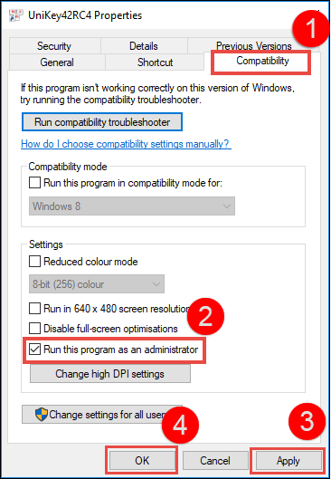 Bước 2: Chọn tab Compatibility. Bước 3: Tích chọn Run this program as an administrator. Bước 4: Nhấn Apply, nhấn OK.