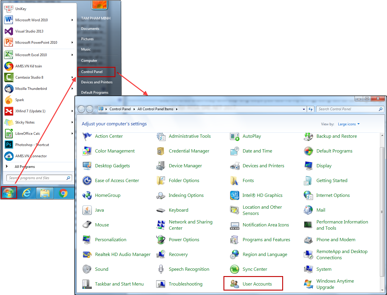 Bước 5: Mở lại Unikey và kiểm tra xem đã gõ được tiếng Việt trên phần mềm chưa? Nếu chưa thì chuyển sang thực hiện mục 2.3. 2.3. Tắt UAC của WindowsBước 1: Vào Start\Control panel, chọn User Accounts.