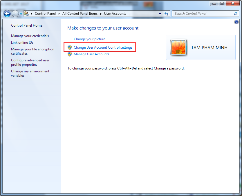 Bước 2: Nhấn Change user Account Control settings.