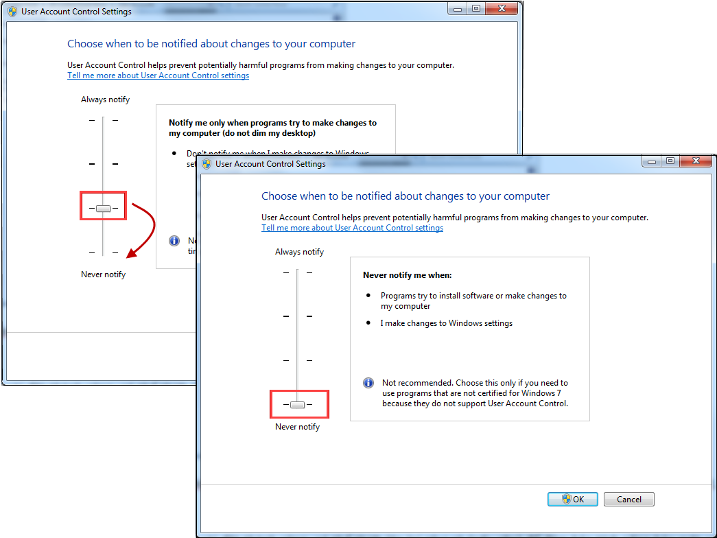 Bước 3: Kéo thanh trượt về mức Never notify, sau đó nhấn OK.