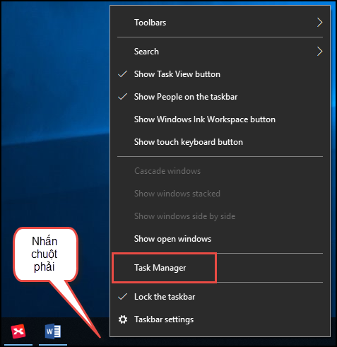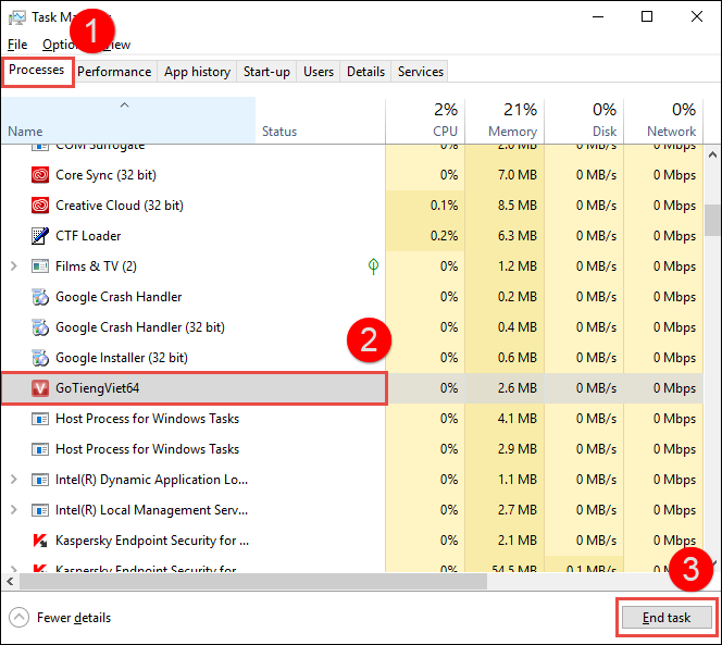 Bước 2: Chọn Task Manager. Bước 3: Tại tab Processes, chọn đến các phần mềm gõ tiếng Việt khác như: VKNT, DotNetKey, Go Tiengviet… Bước 4: Chọn End task.