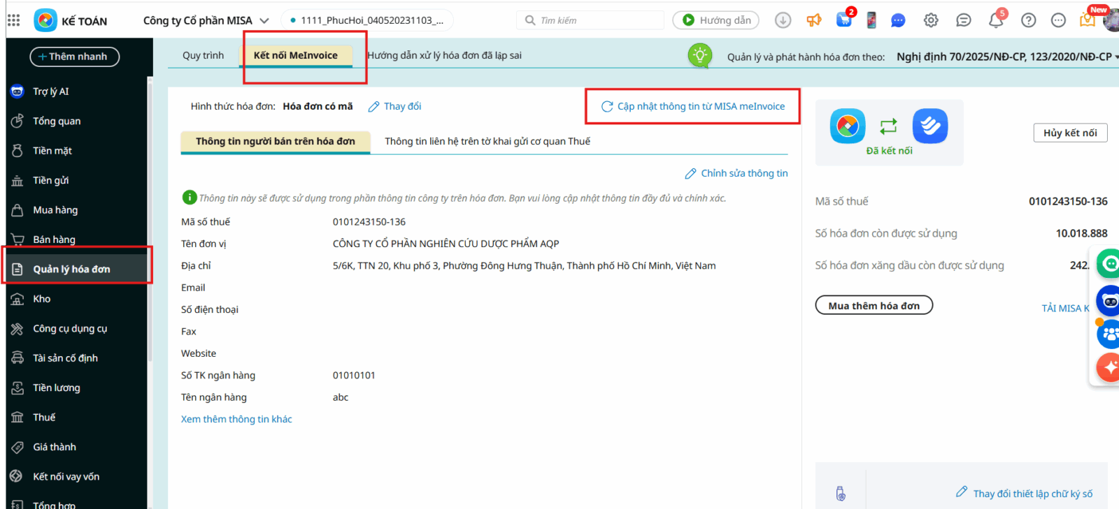 Bước 3: Về phần mềm AMIS Kế toán, vào phân hệ Quản lý hóa đơn\Kết nối MeInvoice\tích vào Cập nhật thông tin từ MISA meInvoice