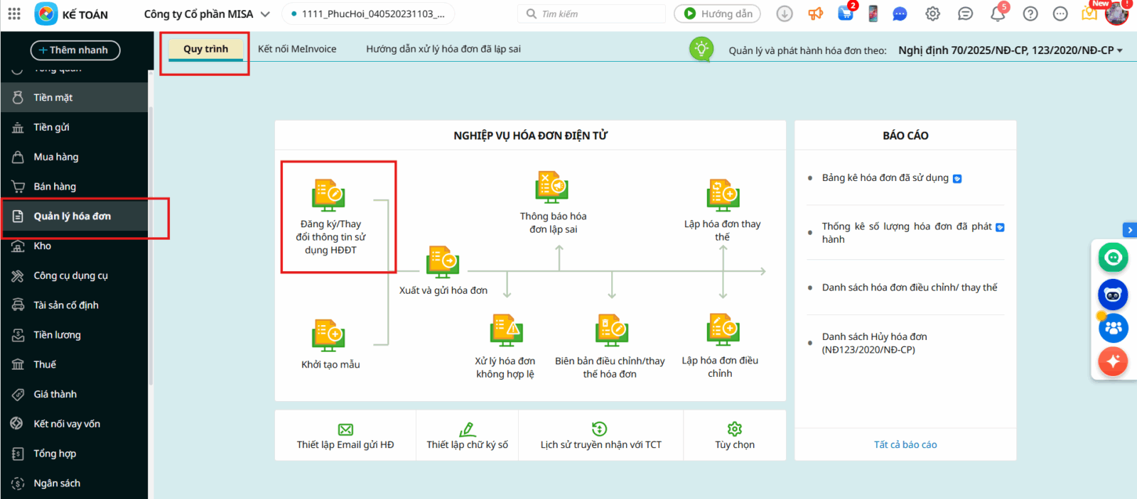 Bước 1: Vào phân hệ Quản lý hóa đơn.Chọn Đăng ký/Thay đổi thông tin sử dụng HĐĐT phần mềm sẽ chuyển hướng sang trang web meinvoice.vn