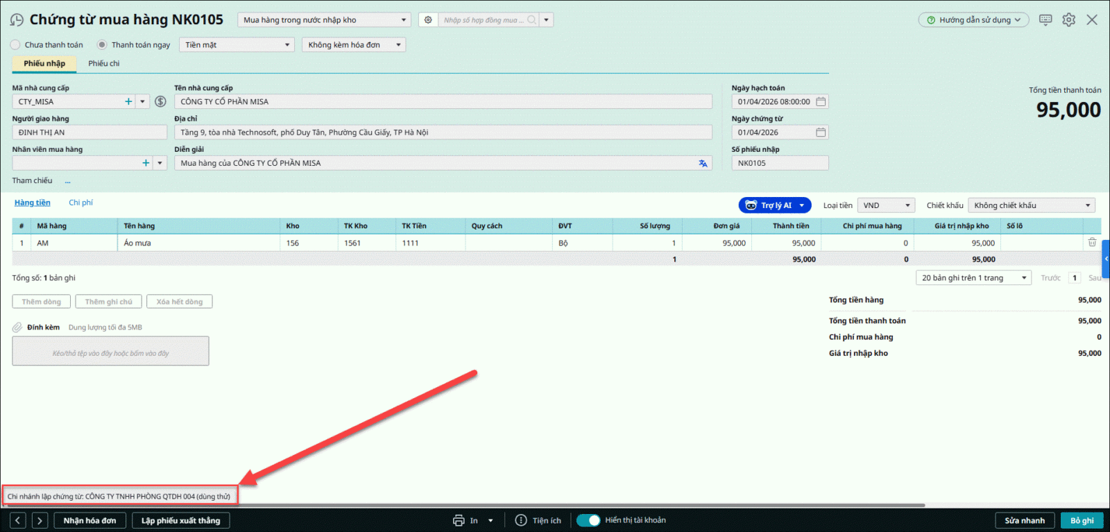 Cách 1: Mở chứng từ cần kiểm tra → xem thông tin Chi nhánh lập chứng từ tại góc dưới cùng bên trái của màn hình.